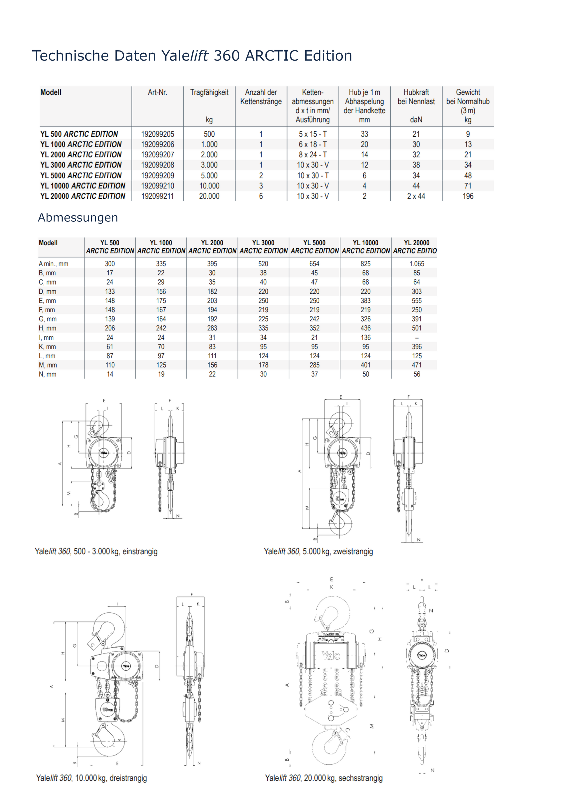 Mit der Yale ARCTIC EDITION konnte der Einsatzbereich des vielfach bewährten Yalelift 360 Handkettenzuges für Anwendungen unter extremen Temperaturen erweitert werden. Hierbei wurde darauf geachtet, dass alle Funktionen, speziell seine innovative 360° Handkettenführung, auch unter extremen Temperaturen optimal und sicher funktionieren. Verwendete Materialien und Schmierstoffe wurden an die Anforderungen angepasst und in aufwendigen Tieftemperatur Testverfahren geprüft und zertifiziert. Hierdurch kann dem Anwender ein sicheres und produktives Arbeiten mit dem Yalelift 360 auch bis Temperaturen von -40°C ermöglicht werden, wohingegen Standard Hebezeuge ohne diese Maßnahmen nur bis -20°C verwendet werden dürfen (DIN EN13157 Krane - Sicherheit – handbetriebene Krane). Neben statischen wurden auch dynamische Tieftemperatur Testverfahren durchgeführt um Fehlfunktionen und Materialversagen auszuschließen.